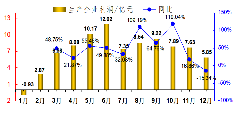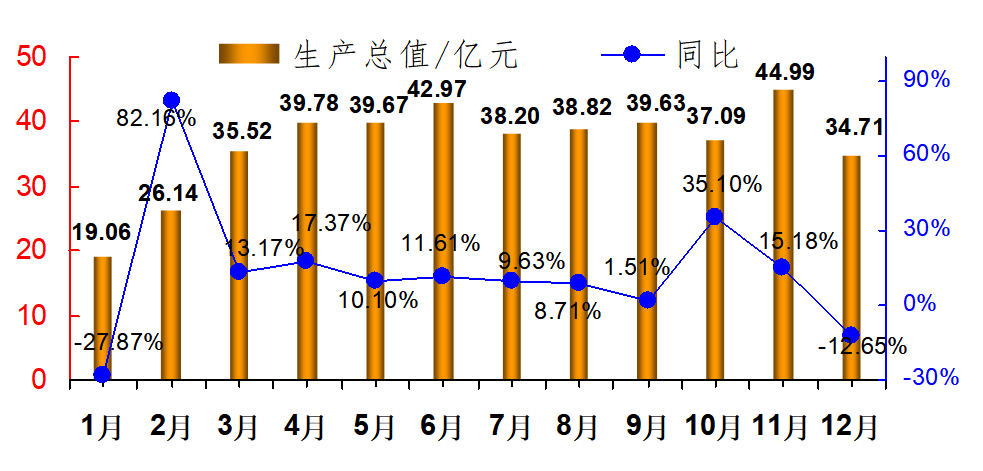 12月份,生產(chǎn)企業(yè)完成生產(chǎn)總值34.71億元,同比下降2.35%;完成銷售總值34.47億元,同比下降1.42%。