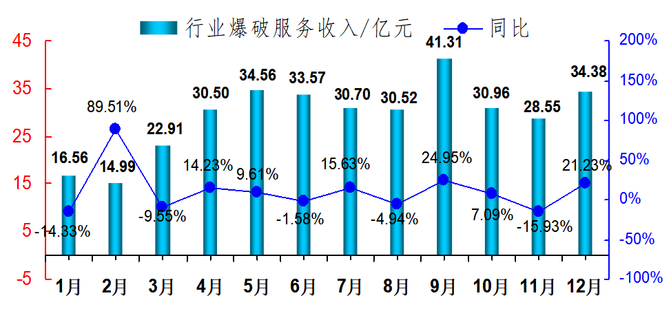 12月份,銷售企業(yè)實(shí)現(xiàn)利稅總額1.76億元,同比下降1.83%;實(shí)現(xiàn)利潤(rùn)總額0.72億元,同比下降42.43%;實(shí)現(xiàn)爆破服務(wù)收入1.09億元,同比下降13.31%。
