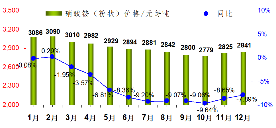 從全年主要硝酸銨品種價(jià)格變動(dòng)情況看,總體價(jià)格呈下降趨勢(shì),均價(jià)為2913元/噸。(具體見附圖中硝酸銨價(jià)格月度變化情況)