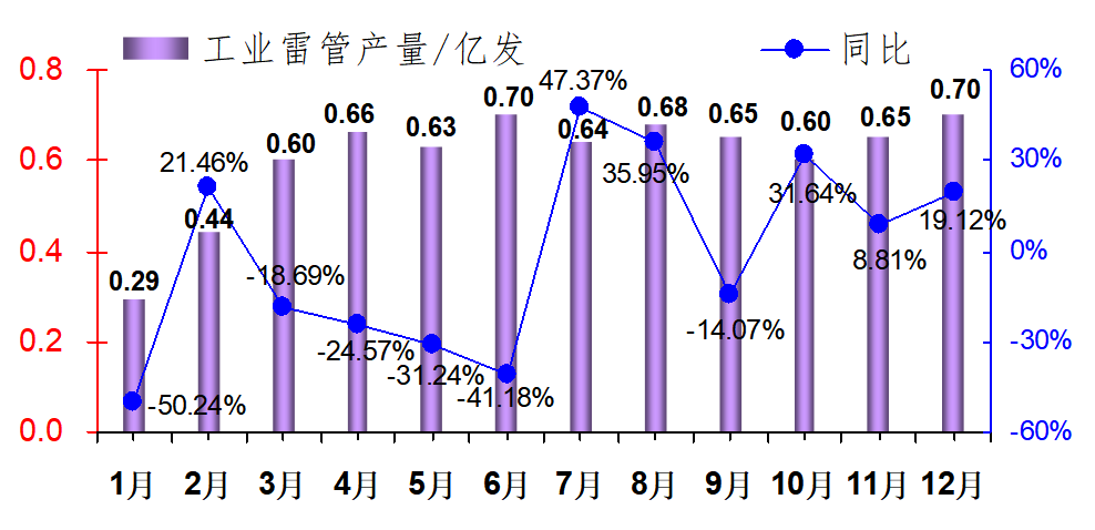 12月份,生產(chǎn)企業(yè)工業(yè)炸藥產(chǎn)、銷量分別為40.25萬(wàn)噸和41.68萬(wàn)噸,同比分別增加1.09%和3.99%;其中,現(xiàn)場(chǎng)混裝炸藥產(chǎn)量為14.00萬(wàn)噸,同比增加7.20%。生產(chǎn)企業(yè)工業(yè)雷管產(chǎn)、銷量分別為0.70億發(fā)和0.71億發(fā),同比分別增加19.12%和13.06%。